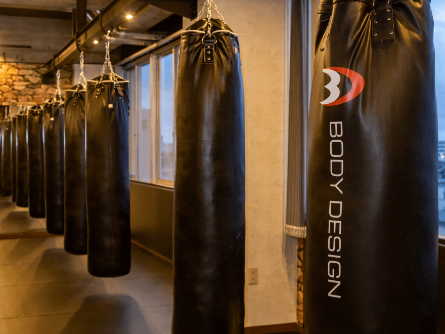 サンドバックもこだわりの本革仕様を5本設置しています。